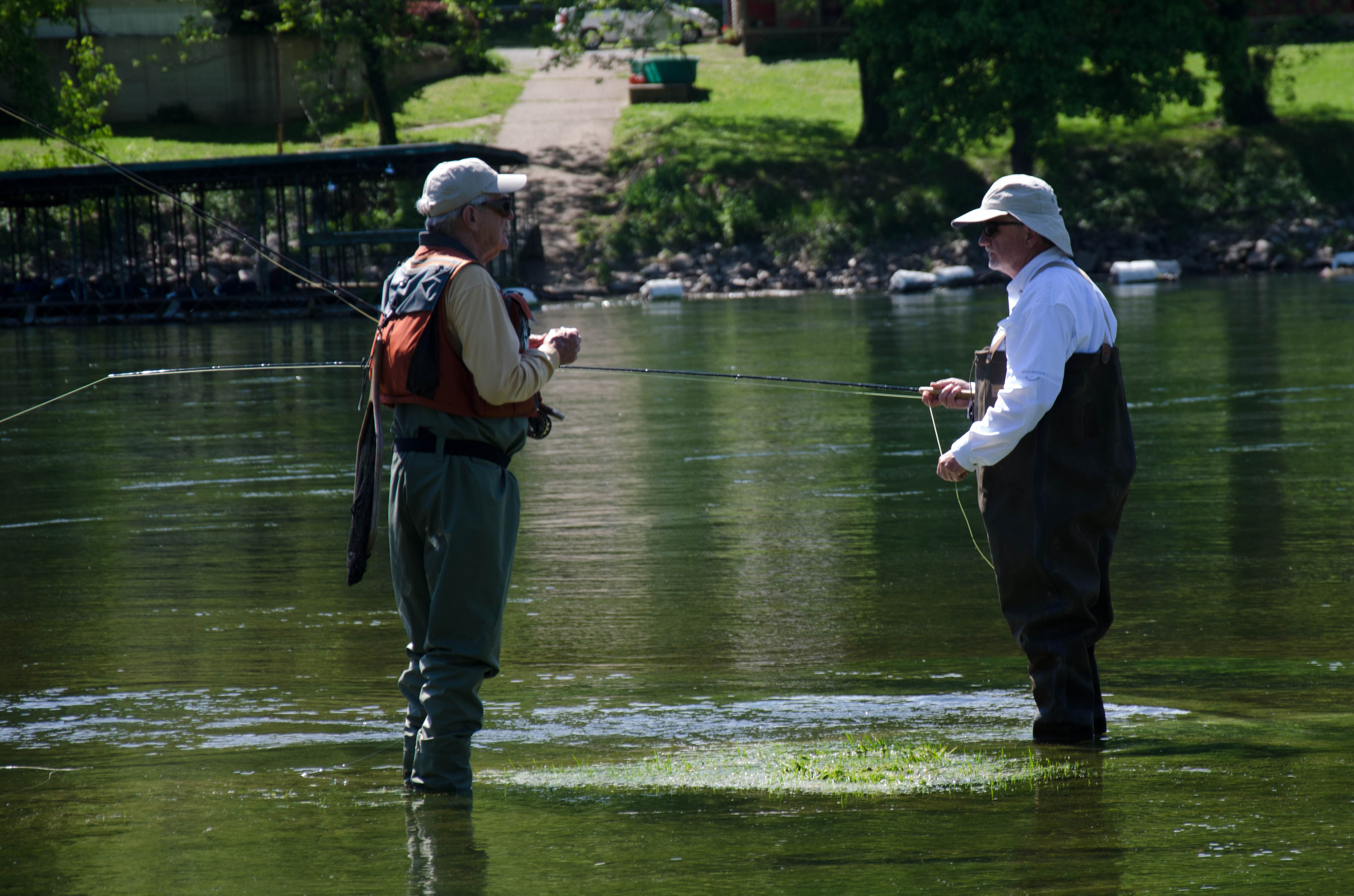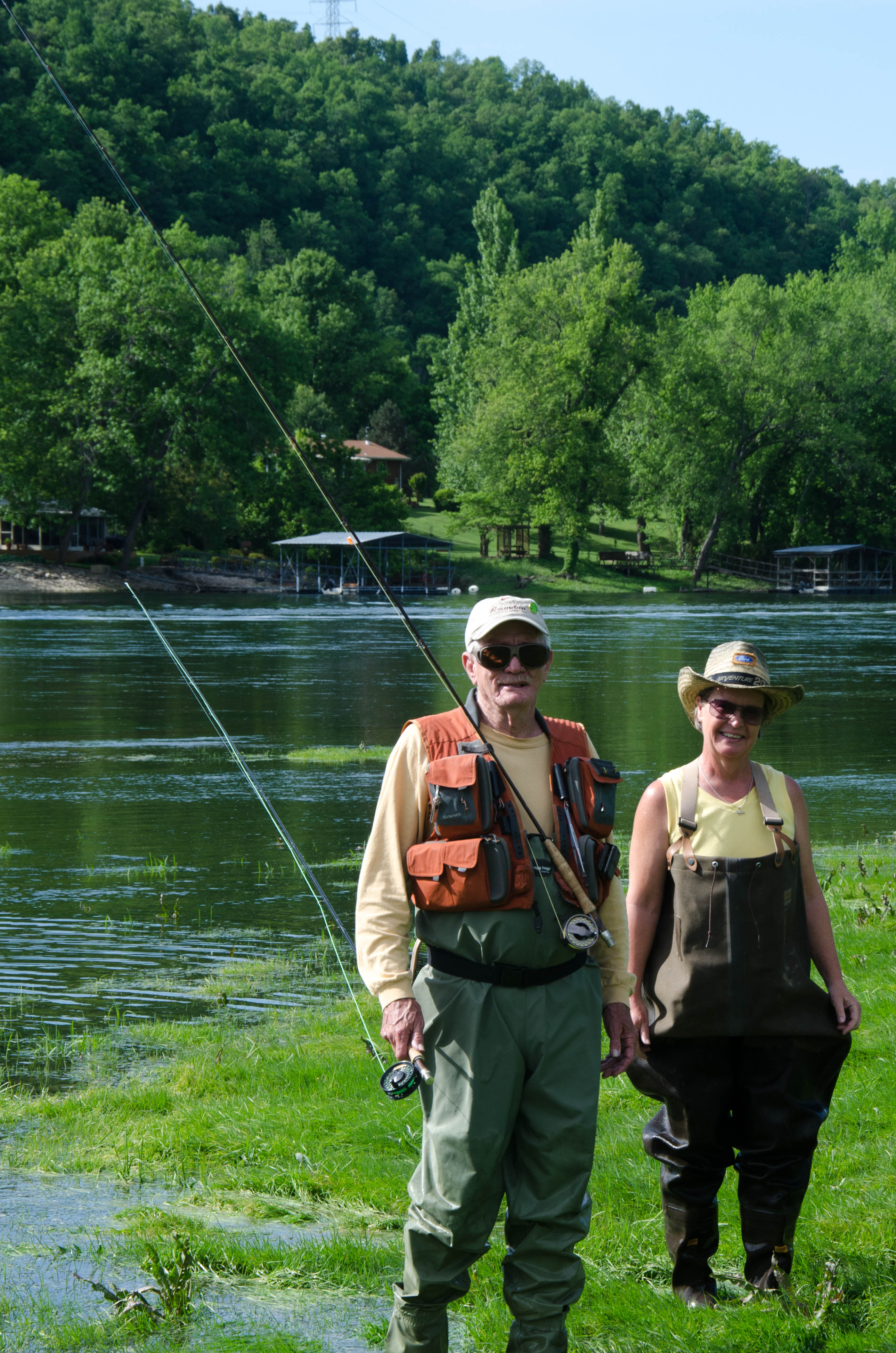 picnic table and proceeded to swap out the waders. While we were putting the waders on Beth, I looked over and Ron had a fish on the line! Once we “put Beth” in the waders and she started waddling back to the river, well, you know me and cameras, I had to get this shot. I’m not sure what possessed me to put the picture on Facebook, but thats another story. Beth did make it to the water with Ron and was doing very well with her fishing skills, but the sun was beginning to set over the Ozark hills. “Boy, I wish we could catch some low water while you guys are here”, Ron said before we left, “I know I can get you on some fish, when are you leaving?”. I told him we planned to leave Sunday and he said he would check the generation forecasts everyday and if we get some “good water” he would meet back up with us at no charge to try to get us on some fish. He also offered to meet us at Dally’s one day to help us get some basic equipment and steer us away from the “eye candy” products, which we did. Over the next few days, I would check the power generation forecast, but it did not look too promising until we got a call late Saturday afternoon… “Paul, It looks like we may have some wadable water in the morning, what is the latest you