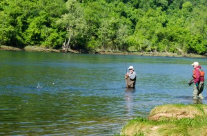 Wading 101… After a short drive up to the Wildcat Shoals Public Access Area, it was time to get in the water. Bull Shoals Dam was still running 4 or 5 units so there was not much safe wadable water around. I watched Ron pull up his breathable stocking foot waders that weighed all of about 8 oz… Hmmm, then I pulled out my 30 year old canvas and rubber booted waders that weighed more than the picnic table we were sitting on and were several sizes too big for me! We decided that I would get in first and Beth would take some pictures from the bank. I followed Ron into the water as he talked about safe wading techniques. Luckily, my 30 year old “bucket butt” waders did not let in any of the 56 degree water. For an hour or so, we practiced casting, mending and stripping line while tying on numerous fly patterns, but had no luck with the fish. “Next”, it was Beth’s turn at the waders, this is gonna be fun!