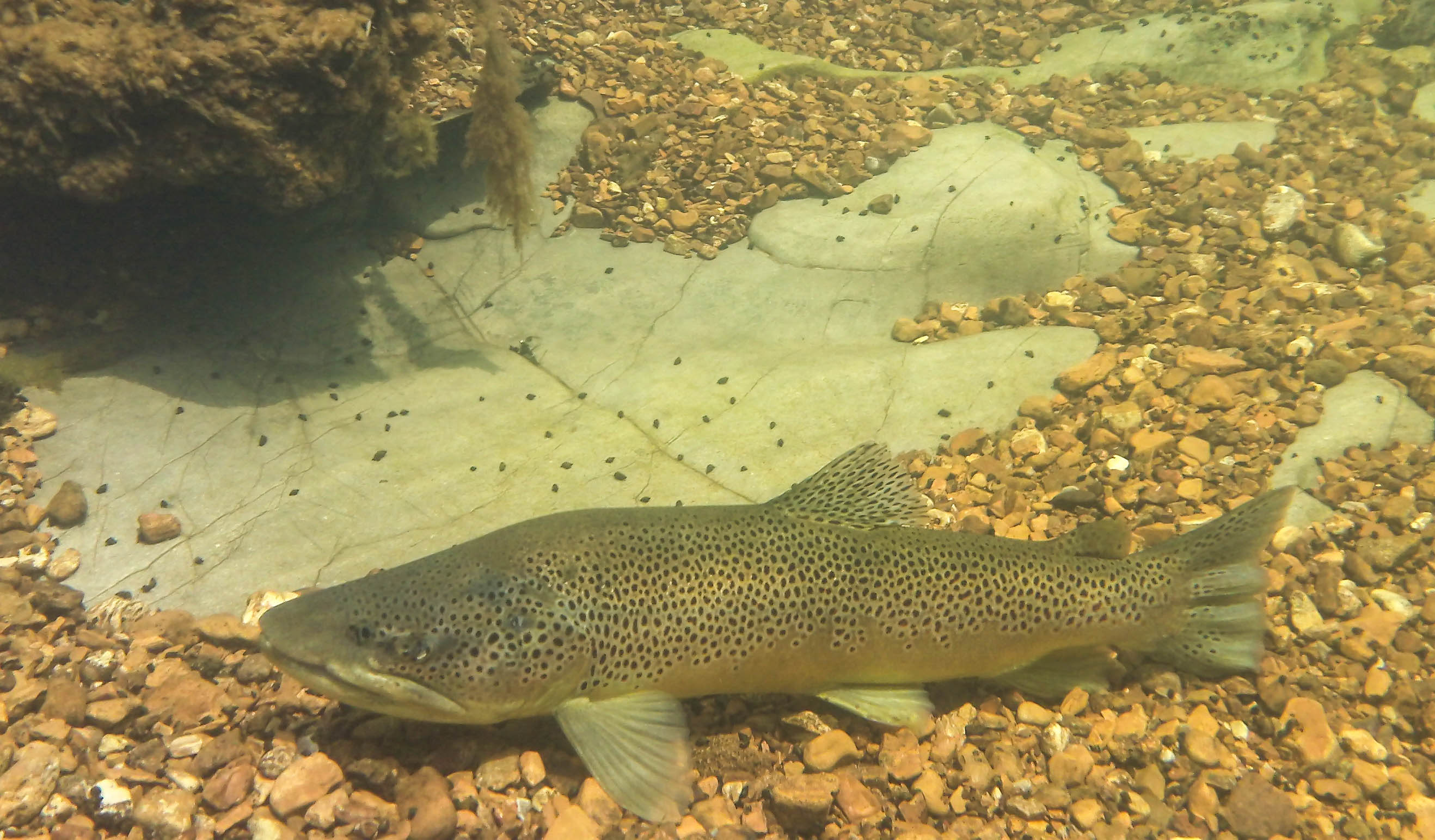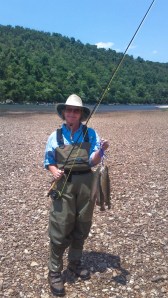 Low Water!… After years of high water and flooding conditions on the White River, things appear to have returned to normal. Several weeks of low or no power generation has made the river safely wadable again and now we have nice new breathable waders (see old wader post!) and are ready to put them to the test. I had called our fly fishing instructor, Ron McQuay before we left, to check his schedule for the weekend and was able to arrange an outing with him on Saturday morning, but tomorrow was Friday and we were going fishing! We started at a familiar location just up from the camper, Wildcat Shoals. Wow, we have never seen it this way, we waded completely to the other side of the river and never got in over 2 feet of water. After fly fishing for hours without any bites, we had our usual picnic lunch next to the river. We decided to pull out out spin fishing equipment when we returned to the water and still had no luck. We could see dozens of fish just under the surface, but could not get them to bite. I even saw a very large brown trout and was able to get so close to him that I took a picture of him with my waterproof camera. We fished for a couple of more hours and gave into the hope of catching fish with Ron in the morning.