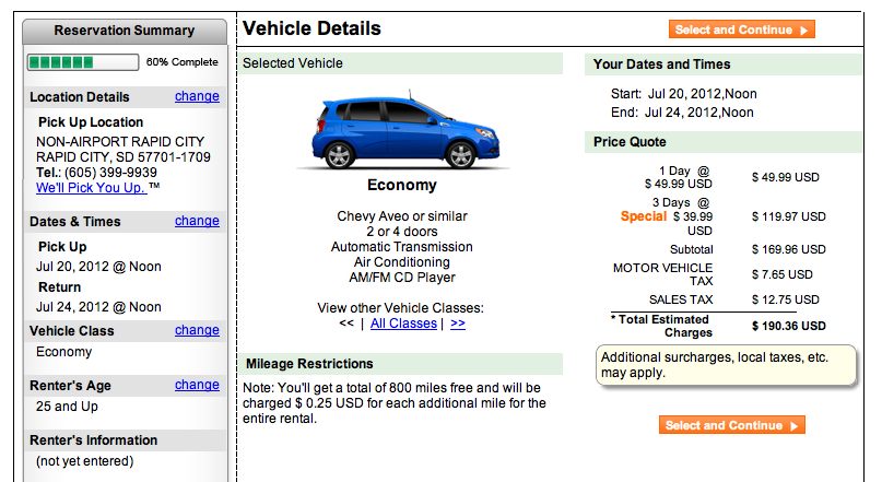FAST FORWARD 24 HOURS… After stewing over this CRAP @ KRAP, I got to thinking that maybe there was a local alternative to the national rent-a-car companies and the whole airport price fixing thing and after a quick Google search, I found several local companies that WOULD pick you up at the airport. I ended up calling Black Hills Car Rentals and talked to John, who said he would pick us up at the FBO for no extra charge and the rate was $37.95 / day plus tax! For a total of $193, we can be picked up at the FBO when we arrive and can leave the car at the FBO when we get ready to depart… now that’s customer service! So, I quickly cancelled the Enterprise contract and I will post our experience with the local company after we return the car, but I am confident, at this point, it will be a good one.