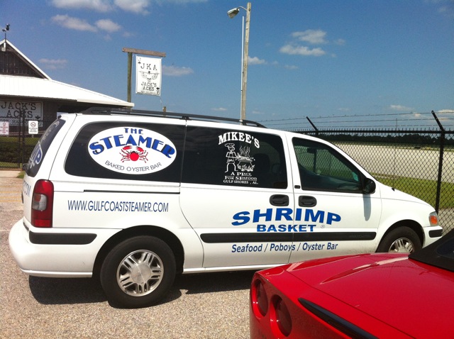 WHAT A RIDE!… Now KJKA is known to have pretty snazzy courtesy cars as Paul and I had found out in the past when we were handed the keys to a very new, bright and shiny yellow Camaro!  We were expecting something pretty great this time as well, when we were handed the keys to the courtesy vehicle.  Paul and I went to get the car while Mike was finishing up some business inside.  While we were indeed happy to have a courtesy car at our disposal for about an hour, we were a little disappointed that this was not the usual “status quo” courtesy car we had come to expect from Jack Edwards.  Although it was parked right next to a bright, shiny red Corvette, that’s as close as it came to being “snazzy”.   A bright white van decorated with the words, “Shrimp Basket”, “Mikee’s – A Place for Seafood” and “the Steamer” proudly awaited us!  The look on Mike’s face was priceless as he walked out of the FBO and saw us waiting for him in the van.  Immediately, he yanked out his phone & snapped a picture of “Driver Paul” in the Van, while not even trying to conceal his fits of laughter.  Regardless, we found our way to the Harbor Grill and enjoyed a fantastic meal while making new friends to boot on our day trip to the LA Riviera.  Paul and Mike had the grouper sandwich, (I think) and Angel, Bob’s fiancee  convinced me that if I really loved a wedge salad, that this was the best one to be found anywhere in the US.  I have to admit I wholeheartedly agree and that this might also be the LARGEST one also, as I boxed up half of it.  You gotta admit, that was some “well traveled lettuce” that accompanied me on the flight back home that day.