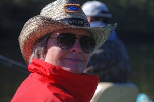Beth’s Second Baptism… We met Ron for breakfast and discussed the water conditions and decided to start our fishing for the day down at Rim Shoals. The outfitter down there offers a water taxi service so we went up the river to where a creek enters the river. As we prepared to enter the water, Ron pulls out this jointed “stick-like” device and starts putting it together. “Hmmm, what is that?” I said, Ron’s reply was “a wading staff, they are nice to have…”. I’m thinking yea, well we waded all around yesterday without incident, so that should not be a problem.