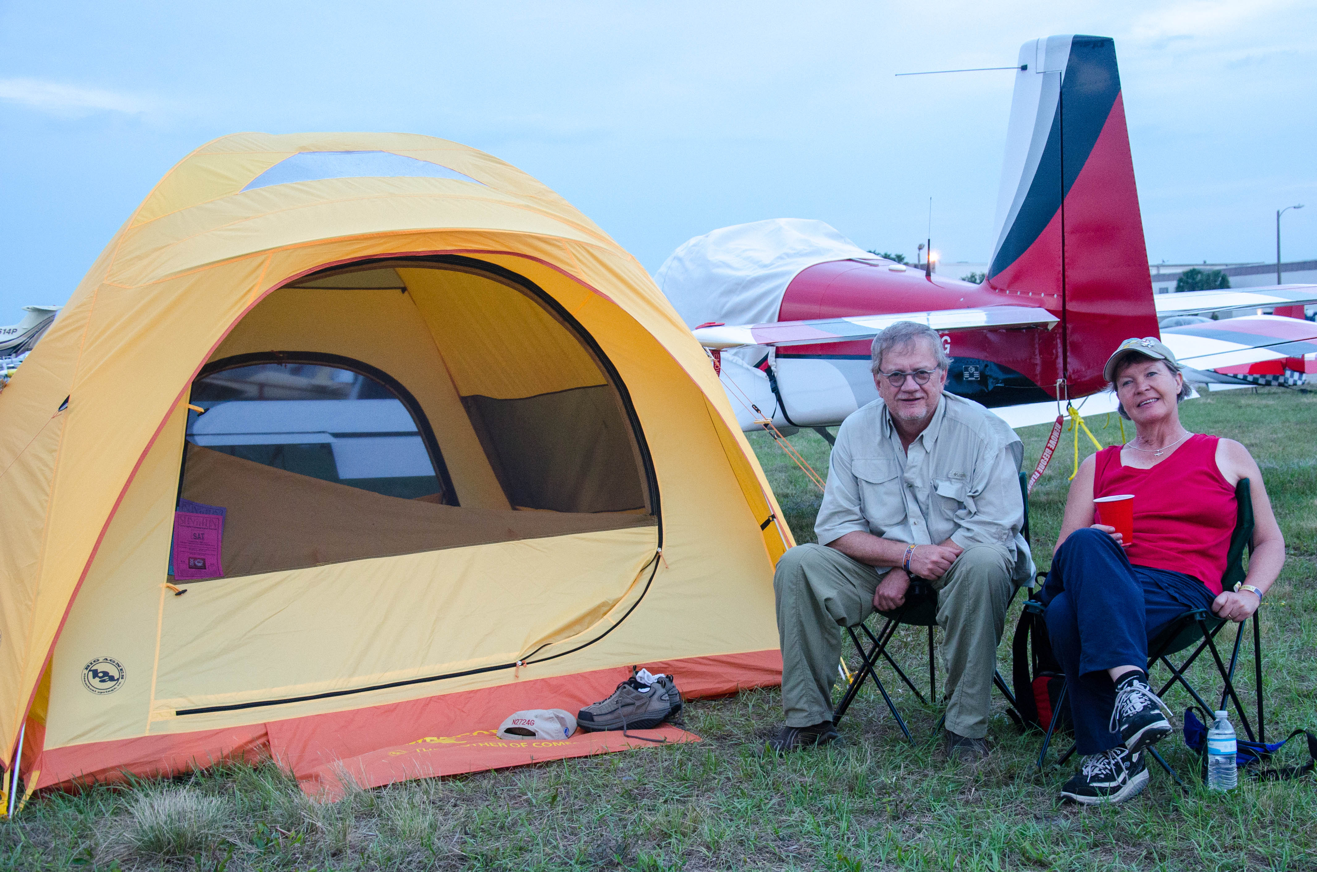We have arrived… once on the ground, we taxi’d to homebuilt camping and began the process of unloading and setting up the tent. This area is away from the other camping areas and we were worried about where the showers were and other amenities, then we met Mary Jane! Mary Jane was like the den mother to the most awesome group of volunteers anyone could ask for. We were treated like royalty; there was cold water, sandwiches, a nice large tent for shelter and an invite for dinner every night! We even had a group of pilot musicians on Saturday night come entertain us. Homebuilt camping is the place to be!