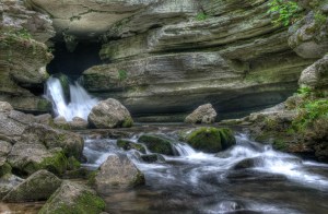 water exits the caverns and creates a beautiful waterfall flowing into a small stream. I set up the camera and tripod to experiment with some 3 frame HDR photos that you can see below. These were all shot at normal exposure and +/- 2 stops. The lighting was not great, but was enough to make the HDR’s look decent. Feel free to comment about the level or quantity of processing in the HDR’s.